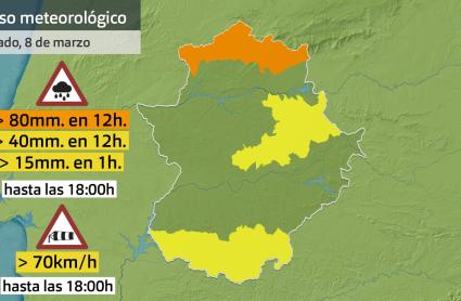 Situación que deja avisos activados hasta las 18 h de este sábado. Serán naranjas en el norte de Cáceres porque se pueden acumular más de 80 mm en 12 horas. Y amarillos en Villuercas y sur de Badajoz por acumular más de 40 mm. También se podrán sumar 15 mm en tan sólo una hora. Además, el viento podrá superar los 70 km/h.