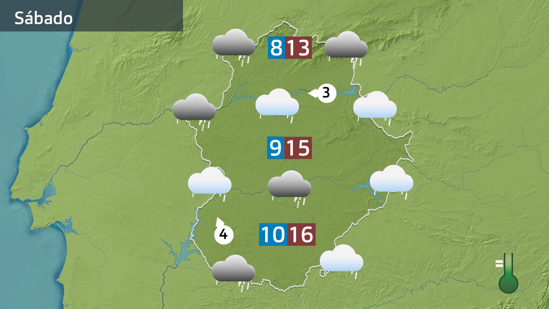 En cuanto a las temperaturas máximas, en la mitad norte de la región ganarán algún grado con respecto a las de este vieres, y ya se moverán entre los 13-15 grados, mientras que, en la mitad sur, descienden ligeramente y los valores máximos se quedarán entre los 14-15 grados, puntualmente los 16.