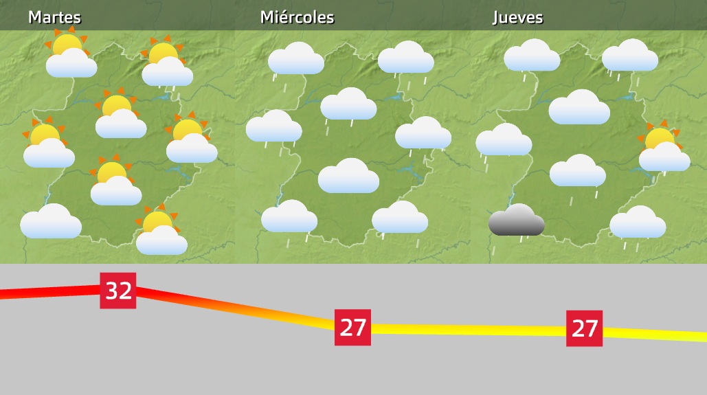 Las temperaturas, a pesar de las nubes, se mantendrán sin cambios. Las mínimas se moverán entre los 13 y los 17 grados y las máximas repuntarán hasta los 30 grados en el llano pacense.