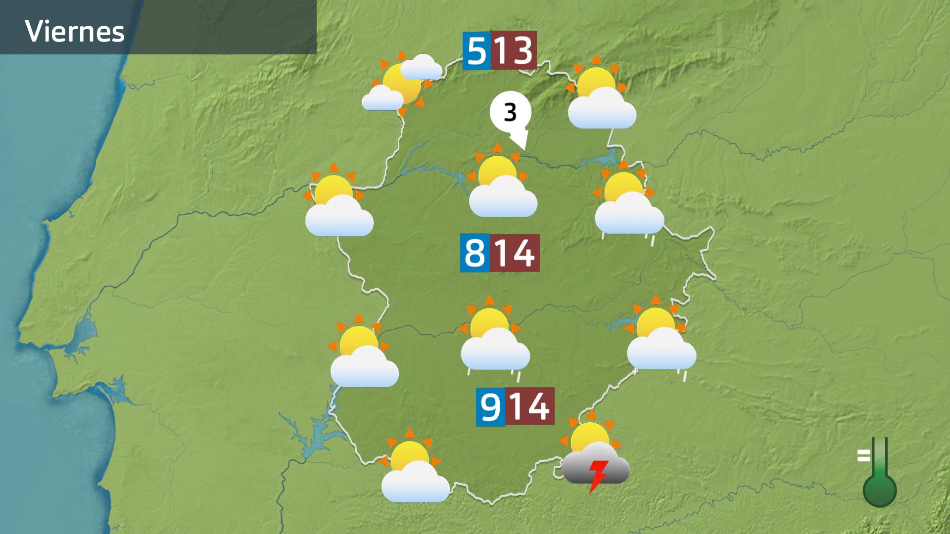 Las temperaturas se mantendrán o irán en ligero descenso. El viento rolará a noroeste, lo cual puede dejar sensación de más frio. los valores reales de las máximas estarán entre los 11 y 14 grados. Más bajas en zonas altas de montaña del norte, centro y sur de la región.