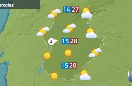 El otro cambio que veremos se reflejará en las temperaturas. Descenderán entre 1 y 4 grados. El descenso más notable se dará en la raya. Sin embargo, hacia el este de la región ese descenso será menos apreciable. Aunque no pasemos de los 30 ºC en ninguna zona, sí alcanzaremos de nuevo los 28 grados en zonas como el Campo Arañuelo o la Serena.