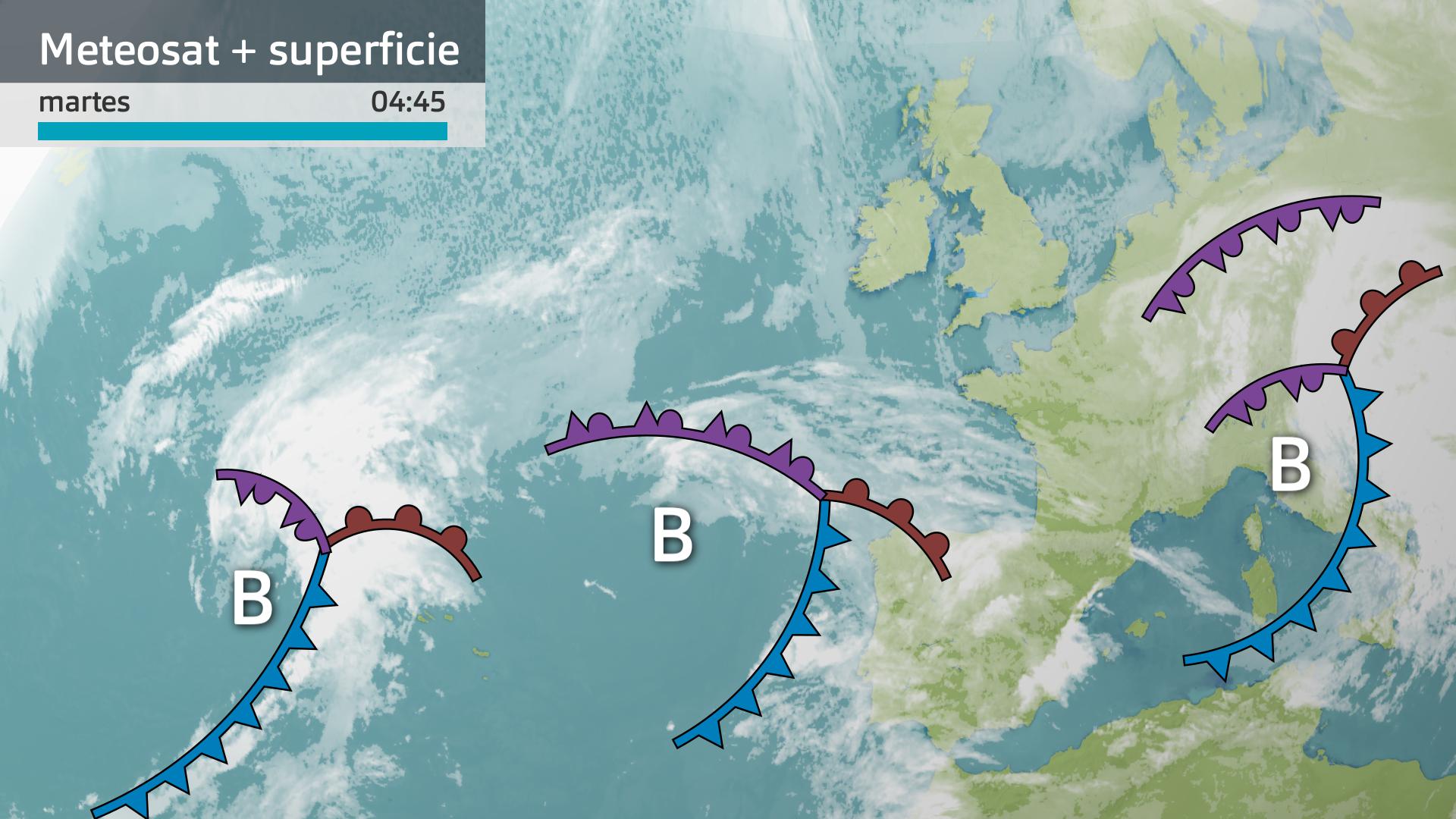 El frente que nos alcanza hoy es un frente cálido y las precipitaciones que veremos a lo largo de la jornada serán más ben lluvias débiles o lloviznas que no conseguirán acumular mucha cantidad de agua, quizá sí un poco más hacia el tercio occidental y que comenzarán ya a desaparecer a partir de media tarde sobre todo.