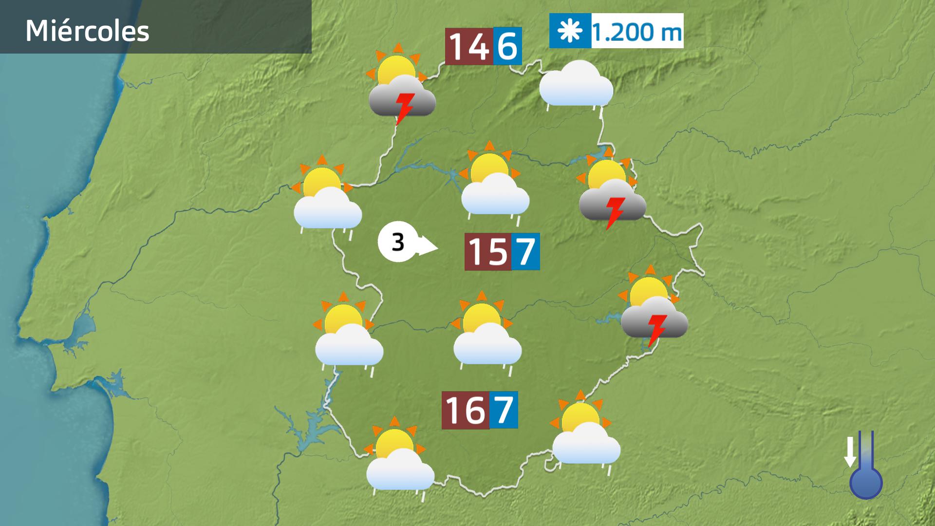 Los chubascos podrán ir puntualmente acompañados de tormenta. Más probables en el centro y norte de la región, y serán en forma de nieve por encima de los 1200 y 1300 metros en el Sistema Central. Baja la cota de nieve y el descenso de temperaturas: estaremos en 17 ºC las más altas, que será en centro y suroeste de Badajoz. En el resto, por debajo. Y en zonas de montaña no subiremos de de los 15 ºC.