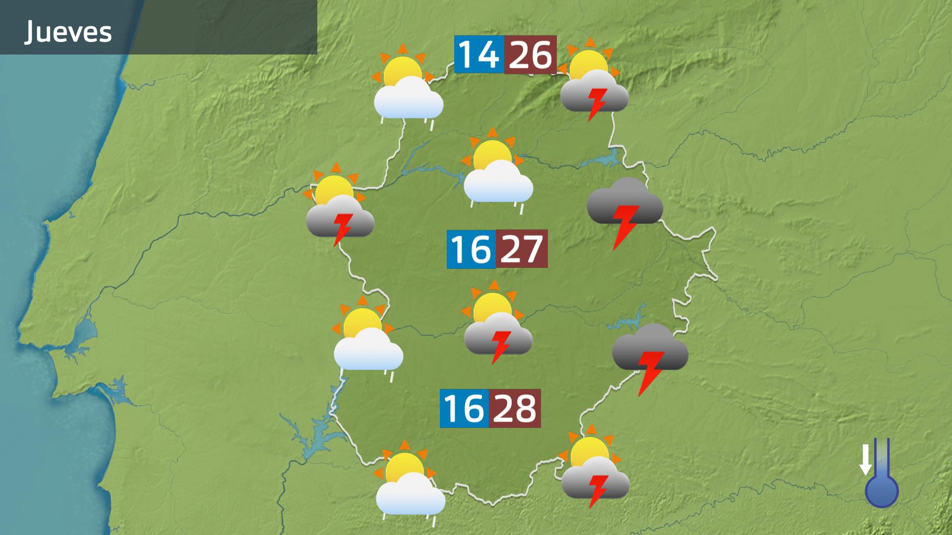 Previsión que obliga a la Agencia Estatal de Meteorología a activar los avisos amarillos por esos fenómenos en toda le región, excepto el sur de Badajoz. Podrán caer 15 litros por metro cuadrado en una hora entre las 3 de la próxima madrugada y las 7 de la tarde de mañana.