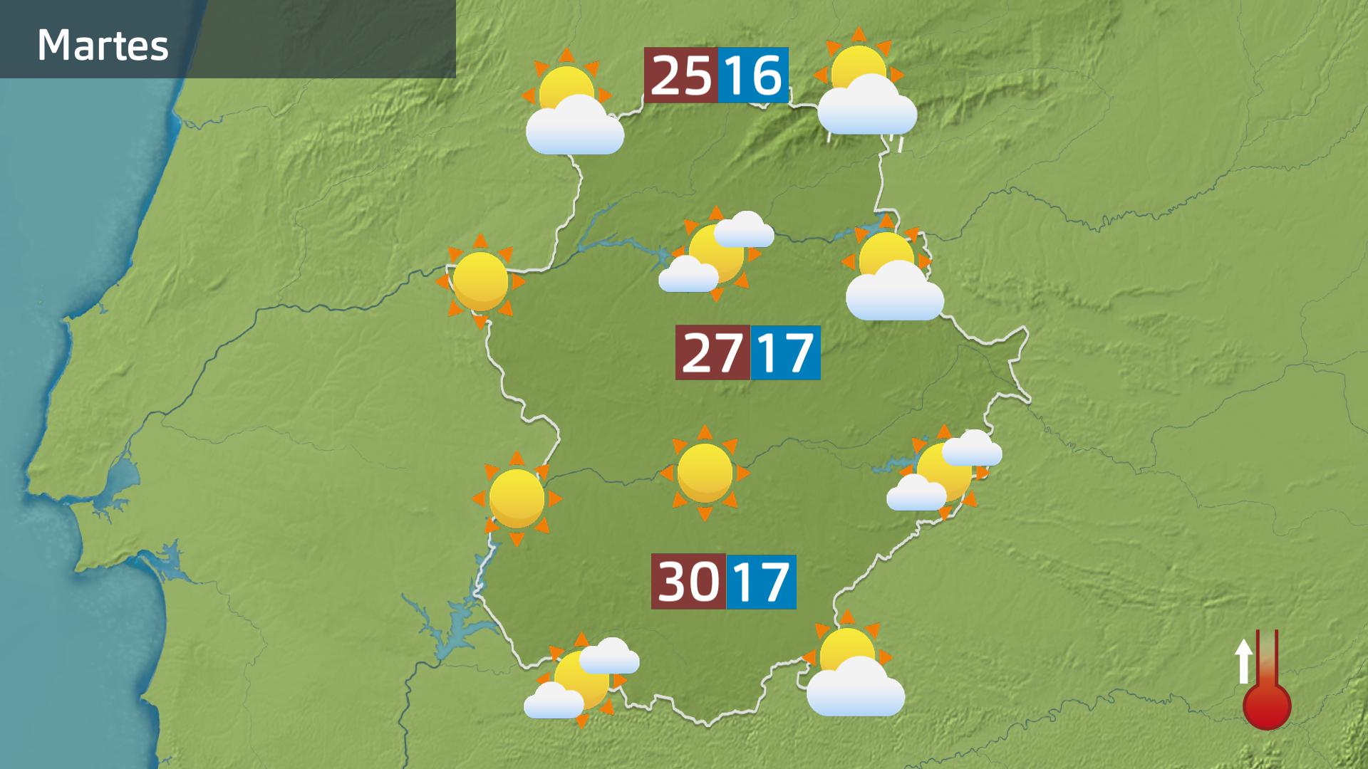 Las nubes de evolución se verán con más abundancia en comarcas de sierra y hacia el este de Extremadura, pero en el centro y este muchas menos. Algo que, en parte, permitirá que las temperaturas sean ligeramente más altas hacia zonas del centro y más pegadas a Portugal. Y el viento seguirá siendo del oeste, flojo.
