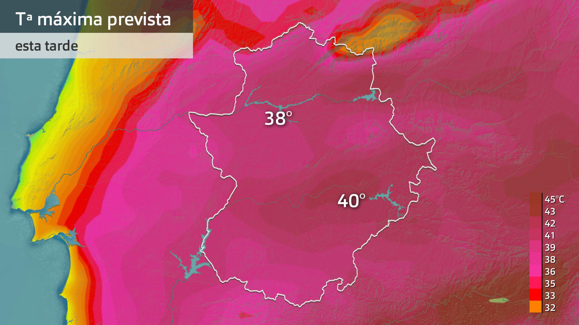 En cualquier caso no es en estas temperaturas mínimas donde más notaremos el ascenso hoy, este lunes será sobre todo en las máximas en las que veremos la subida más destacable. Un ascenso ojo, de más de 4-5 y hasta 6 grados con respecto a los valores del fin de semana y que nos llevará a temperaturas ya para esta tarde por encima de los 40 y hasta de los 41 grados en algunas zonas del llano y en general a máximas de más de 36-39 en todas las comarcas.
