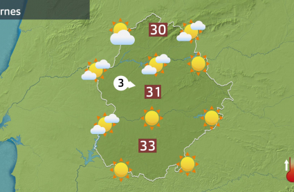 Con respecto a las temperaturas máximas, alcanzaremos hoy los 30 grados en prácticamente toda la región, algo menos en el Sistema Central donde les costará llegar a los 25. Los termómetros llegarán a los 32- 33 grados en comarcas como el Campo Arañuelo, las Vegas del Guadiana o la Siberia y la Serena, donde incluso podemos alcanzar los 34.