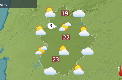 Eso sí en el tercio norte la mañana es algo más fresca y bajamos en general de esos 7-8 y hasta de los 5 grados. Eso en las mínimas, en las máximas a pesar de todas estas nubes que se nos colarán a lo largo del día esperamos valores que ronden ya hoy los 22-24 grados incluso en algunas zonas del tercio occidental y el suroeste sobre todo, máximas un para de grados por encima de las de ayer, aunque en general costará fuera de estas comarcas ir más allá de los 18-20 o 22 grados como mucho