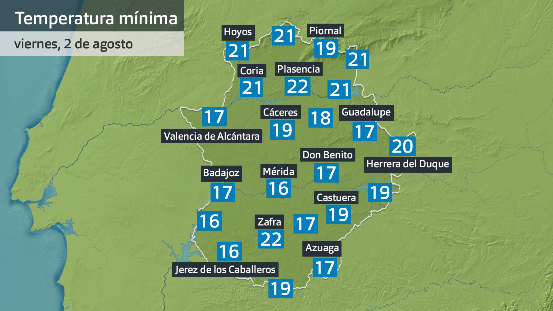 Aunque sí se alcanzarán con facilidad hacia el este de la región, sobre todo en localidades del Campo Arañuelo y del nordeste de Badajoz. Incluso en algunas de esas comarcas llegarán a los 38 ºC. En el resto estaremos entre los 34 y 37 grados, e incluso por debajo en poblaciones más altas de sierra. Será un día con menos calor en general.