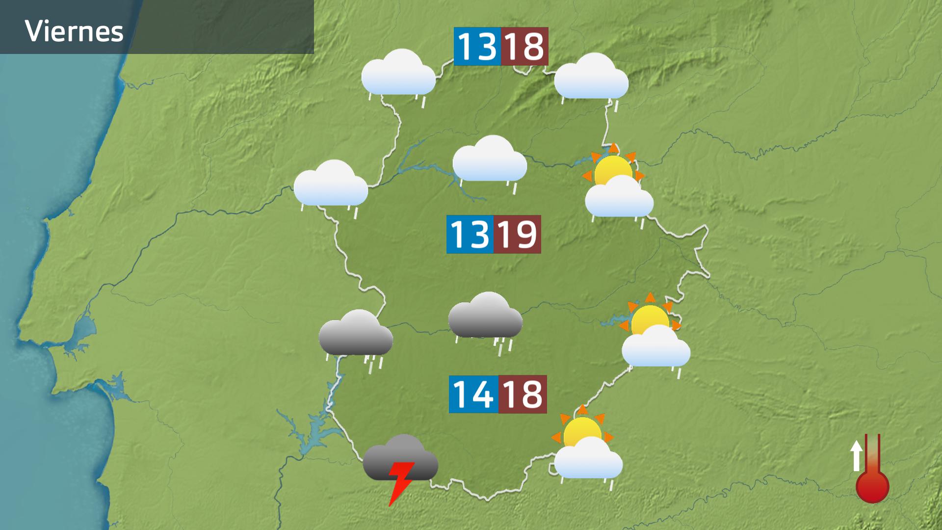 Las zonas donde las lluvias estarán más aseguradas será todo el eje central de la región, de norte a sur, las comarcas del norte, las de la raya y el sur de Badajoz. En esas zonas serán intermitentes pero a ratos lloverá con moderación. Hacia el este de la región serán algo menos probables y más débiles.