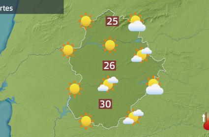 Una subida de los termómetros más bien discreta pero que nos dejará ya para esta tarde máximas alrededor o por encima de la raya de los 30 grados en algunas zonas del llano hacia el sur y el suroeste de Extremadura, por donde más notaremos hoy el ascenso de los termómetros.