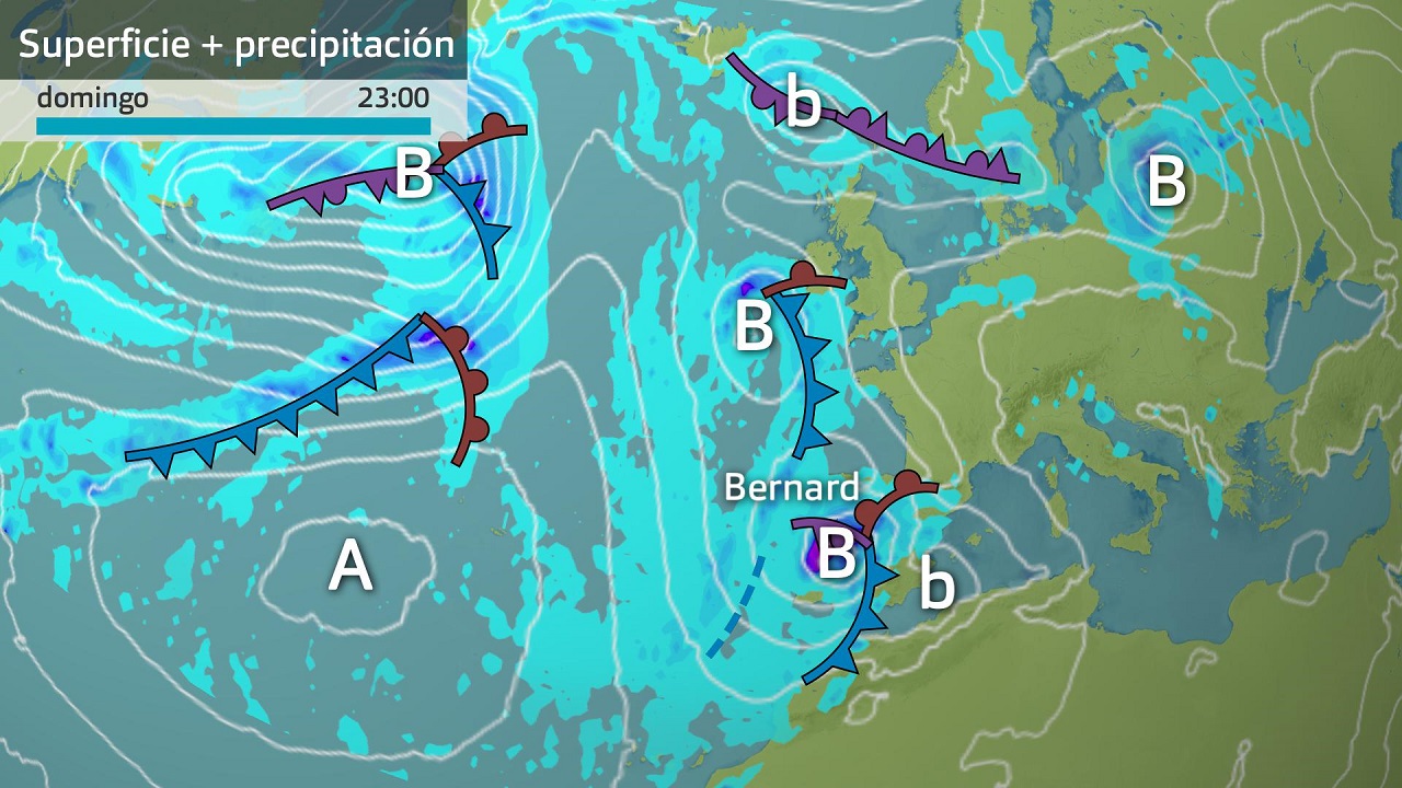 La semana se despedirá con la llegada de Bernard, una nueva borrasca de gran impacto. Una borrasca que entrará por el suroeste peninsular y que dejará lluvias generosas y fuertes rachas de viento.