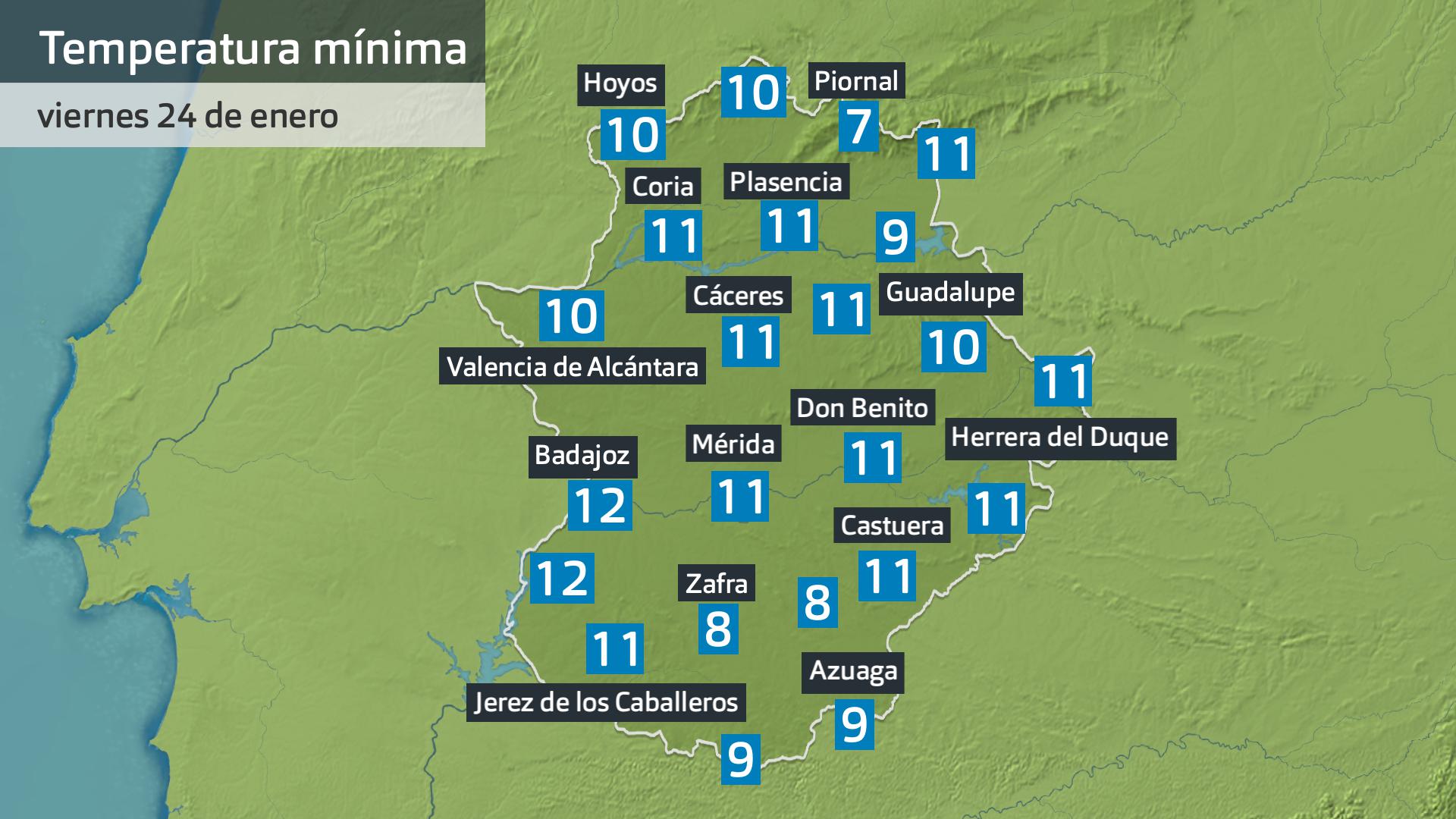 Todo en un viernes con temperaturas que vuelven a ser altas para un mes de enero. Y es que aunque vemos esta mañana valores en los registros de temperatura algo por debajo de los de ayer, hoy estas mínimas son de la madrugada o del primer tramo de la pasada noche incluso y en esta primera mitad de la mañana de lo que volvemos a hablar es de temperaturas por de los 10-11 grados en muchas estaciones.