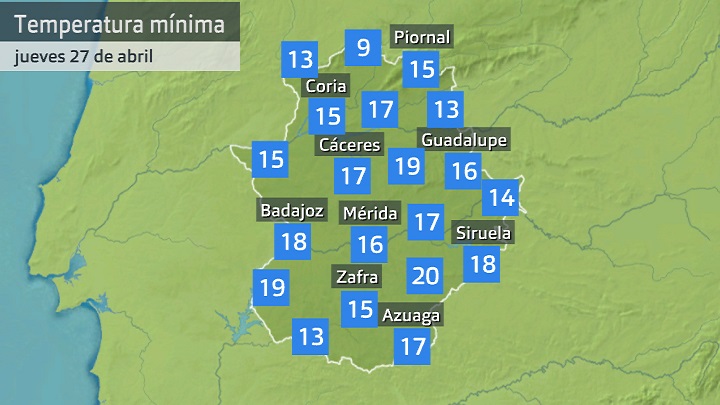 Eso en las máximas, en las mínimas también hablamos de un ambiente hoy ya de finales de junio o principios de julio con valores que en esta primera mitad de la mañana se mueven hoy por encima de los 14-16 e incluso de manera puntual de los 17 grados. Temperaturas también extraordinariamente altas porque a estas alturas de la primavera lo propio sería hablar de mínimas alrededor de los 10-11 grados.