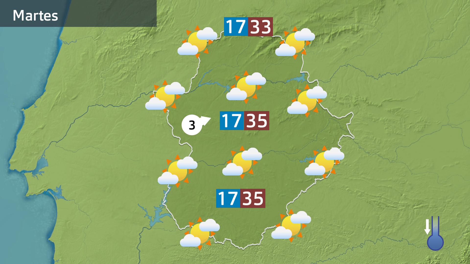 Las temperaturas empezarán a descender principalmente por el oeste de la región. Cuanto más cerca de Portugal, más se apreciará el descenso. Pero todavía se quedarán por encima de los 33 grados en casi todas las comarcas, a excepción de las poblaciones de sierra. Las mínimas irán ligeramente a la baja, y se quedarán otra vez por encima de los 20 ºC en las comarcas del este.