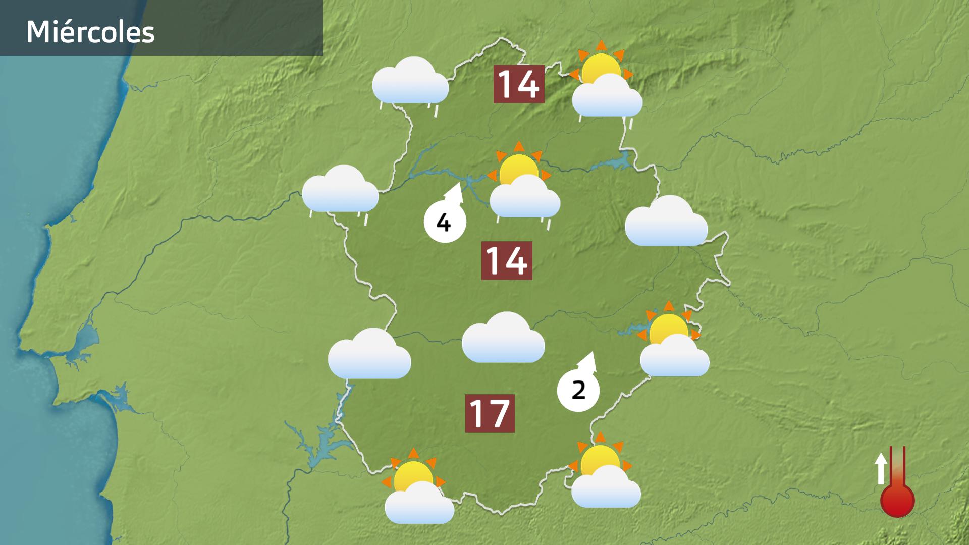 Aunque no esté lloviendo en toda la región durante todo le día, sí veremos mucha nubes y también bancos de niebla. Los más probables se extenderán en la zona centro y alta del Guadiana, la Serena, la Siberia, Campiña Sur, así como en puntos del centro y este de la región y las riberas del Tajo. Esa niebla irá levantando, pero el cielo estará con intervalos de nubes y claros.