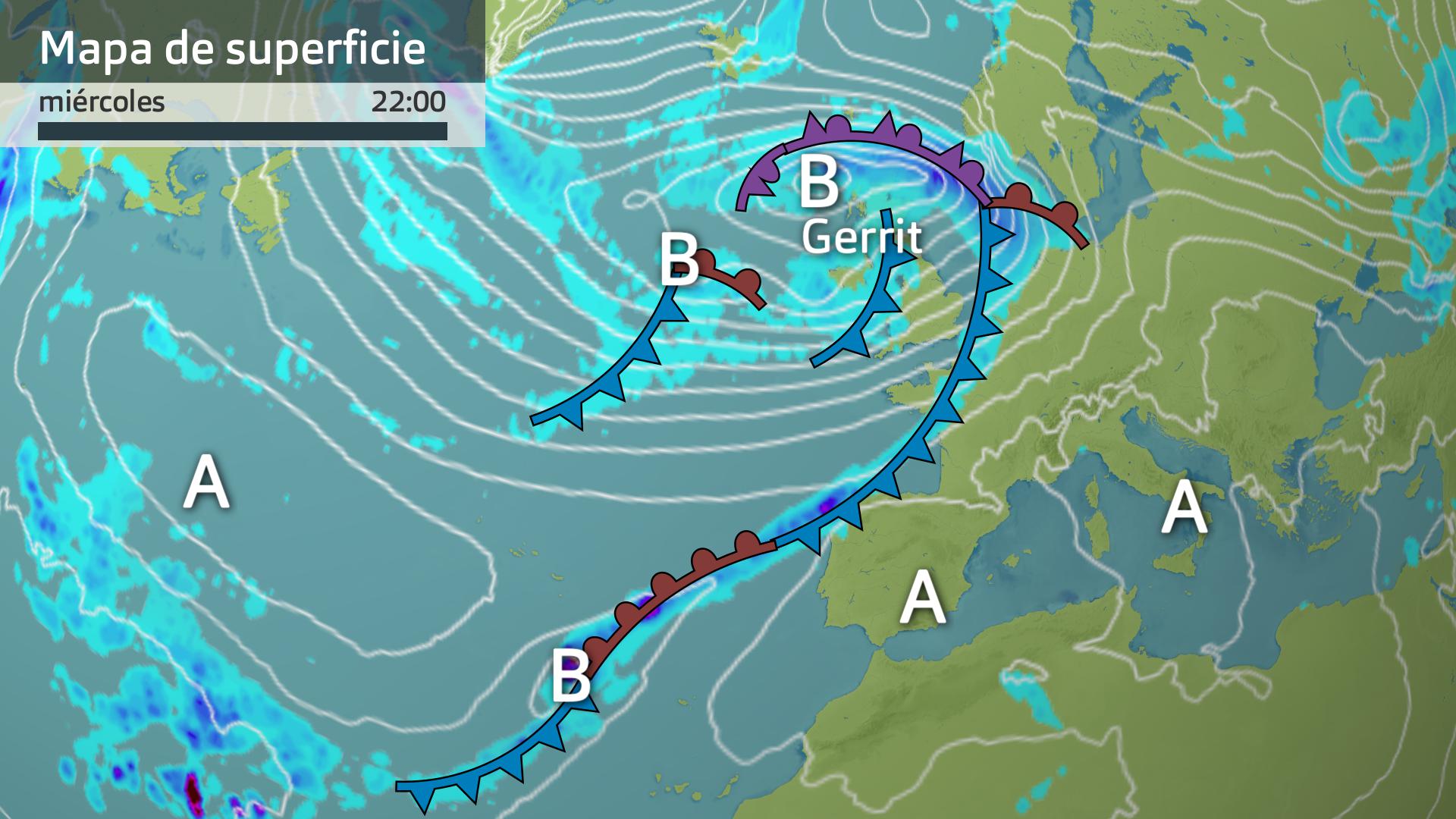 El mapa de superficie previsto para esta noche nos muestra el avance de una línea frontal que afecta a Galicia. En cambio, Extremadura y buena parte de la península sigue bajo el dominio de las altas presiones.