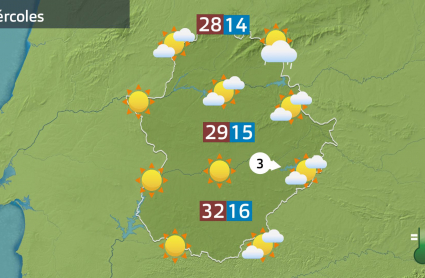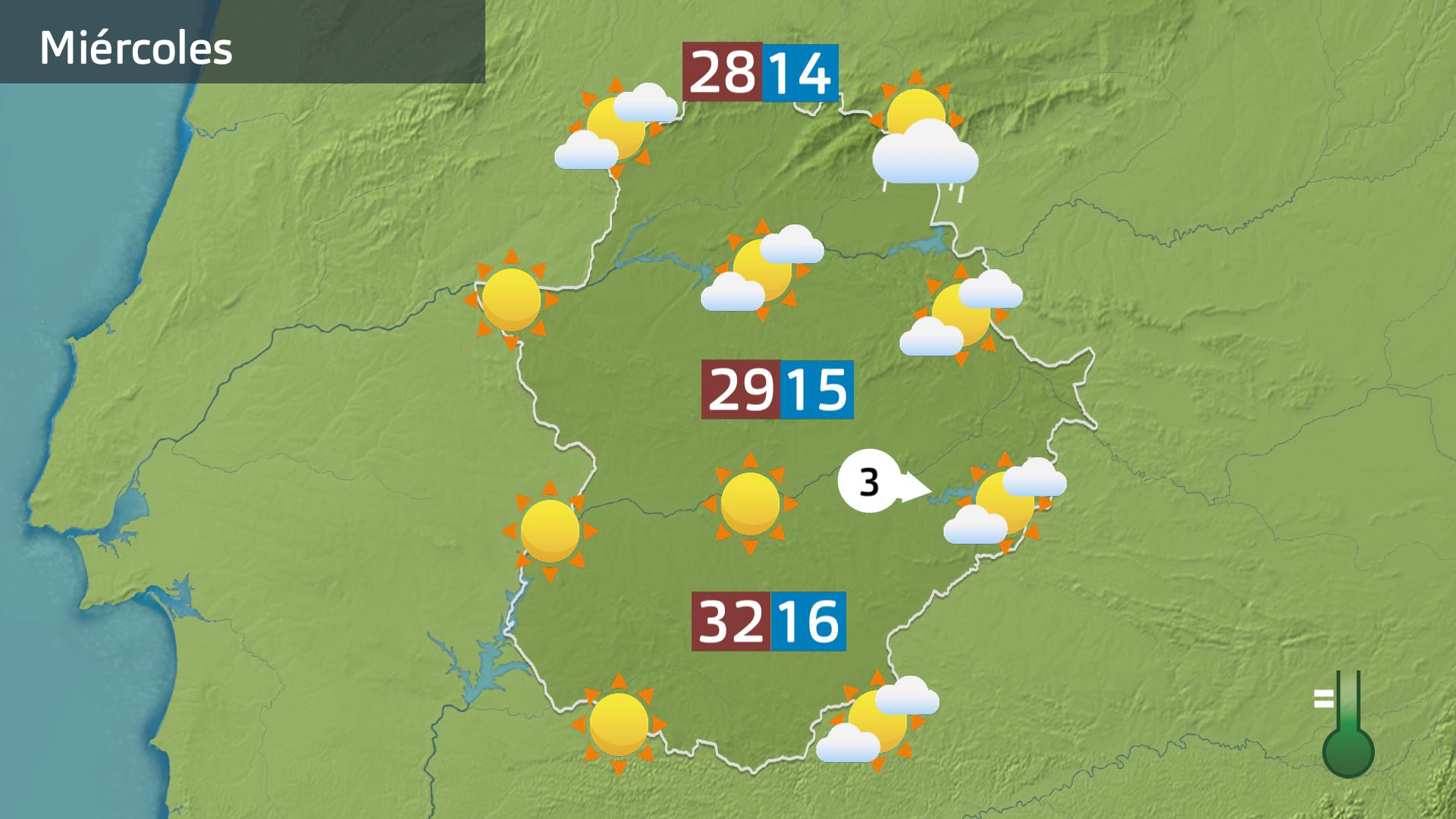 No tendremos muchos cambios en las temperaturas. Tanto mínimas como máximas se mantendrán sin grandes variaciones. Las más altas, de nuevo, hacia el Guadiana donde rondarán los 31 y 32 grados. En el resto, por debajo. Y por debajo de los 16 ºC en las mínimas. El viento soplará del oeste con rachas más destacables hacia las Villuercas por la tarde.