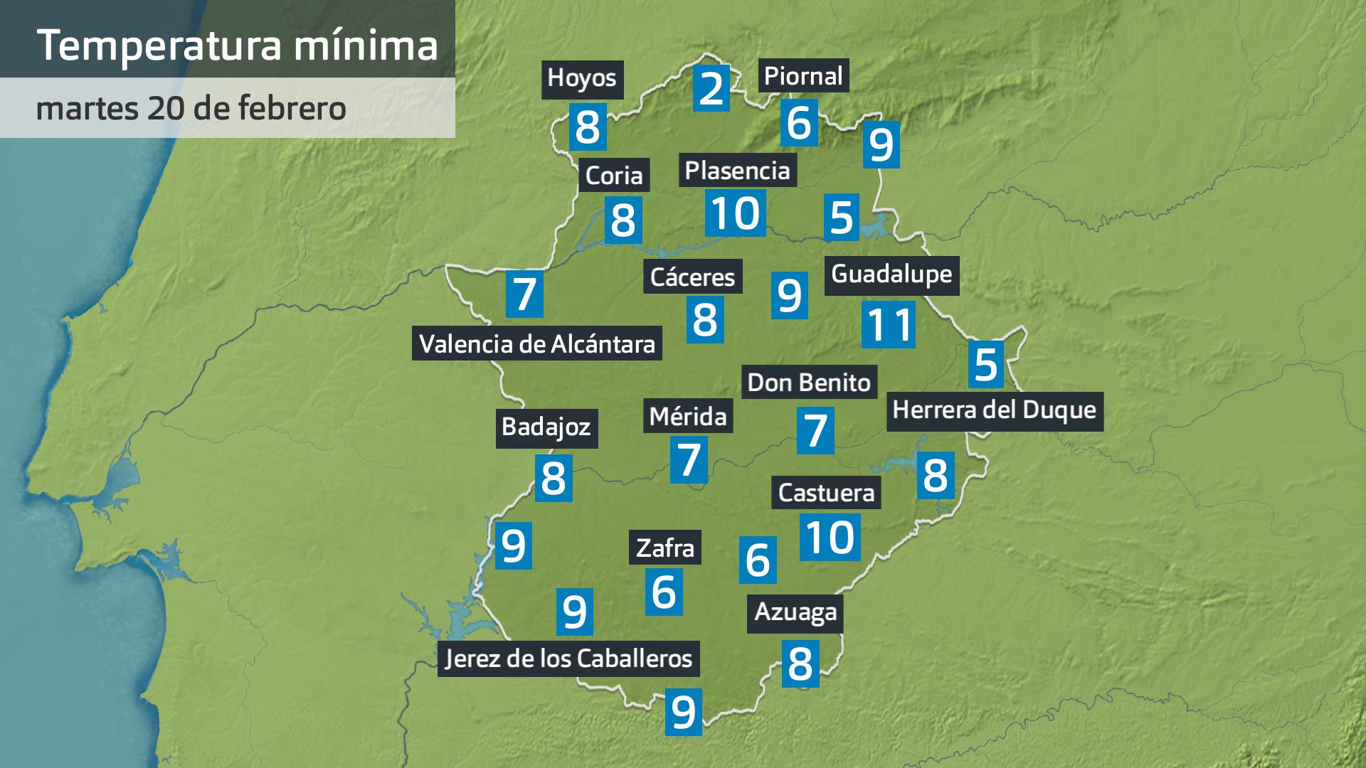 Las que sí son incluso un poco más altas que las de ayer, son las mínimas. Un discreto ascenso de todas formas que no evita que en algunas zonas el termómetro baje en este primer tramo del martes de los 4-6 grados. Unas temperaturas, las de esa mañana que no son tampoco especialmente bajas para un mes de febrero.