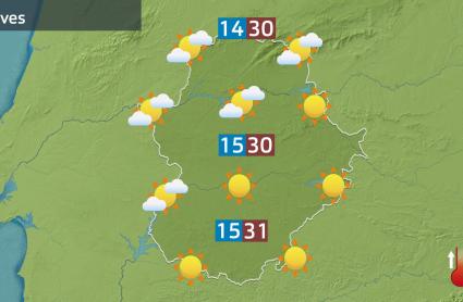 Por un lado, las mínimas no tendrán muchos cambios y se quedarán entre los 13 y 15 grados al empezar el día casi en toda la región. Pero las máximas sí seguirán en ascenso. Si en la tarde de este miércoles ya se han alcanzado los 30 ºC en varias zonas del norte y del Guadiana, mañana esos valores serán más generalizados al Tajo y otras zonas del suroeste de la región.