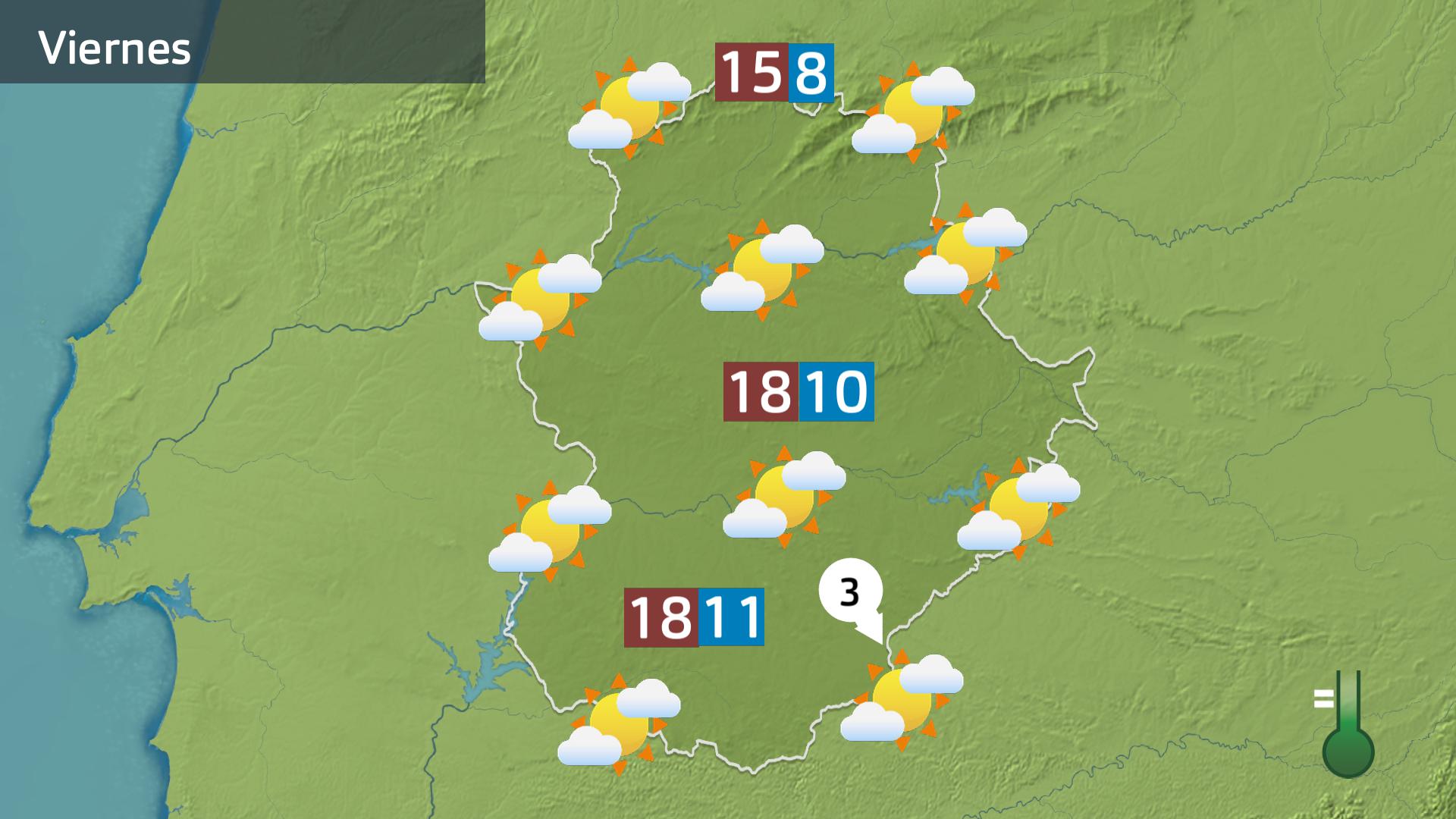 Se alejan definitivamente las lluvias y las tormentas que hoy nos han acompañado, pero todavía tendremos algo de nubosidad. Serán nubes de tipo alto y alguna nubes media. Lo suficiente para no tener el cielo completamente despejado. Aunque tampoco serán muy abundantes. El viento rolará a componente noroeste y por la mañana dejará alguna racha destacable en el sureste de Badajoz.