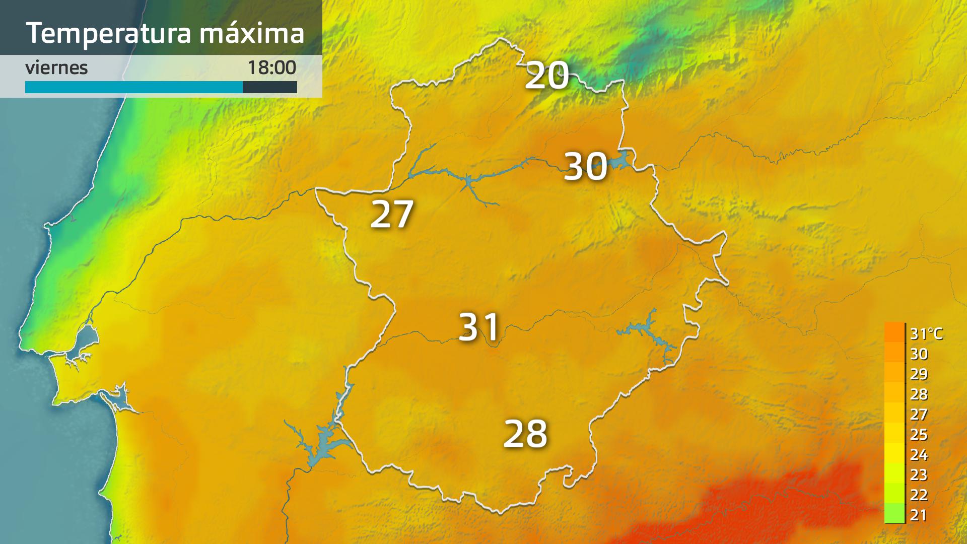 Las temperaturas máximas vuelven hoy a ascender en el termómetro y rondaremos los 30 grados en las comarcas del suroeste, Vegas del Guadiana o Campo Arañuelo, e incluso podemos llegar a los 31. Nos quedaremos en valores algo más cortos en el resto, incluso en las zonas de montaña como Villuercas- Ibores o el Sistema Central donde no pasaremos de los 25 e incluso 20 grados.