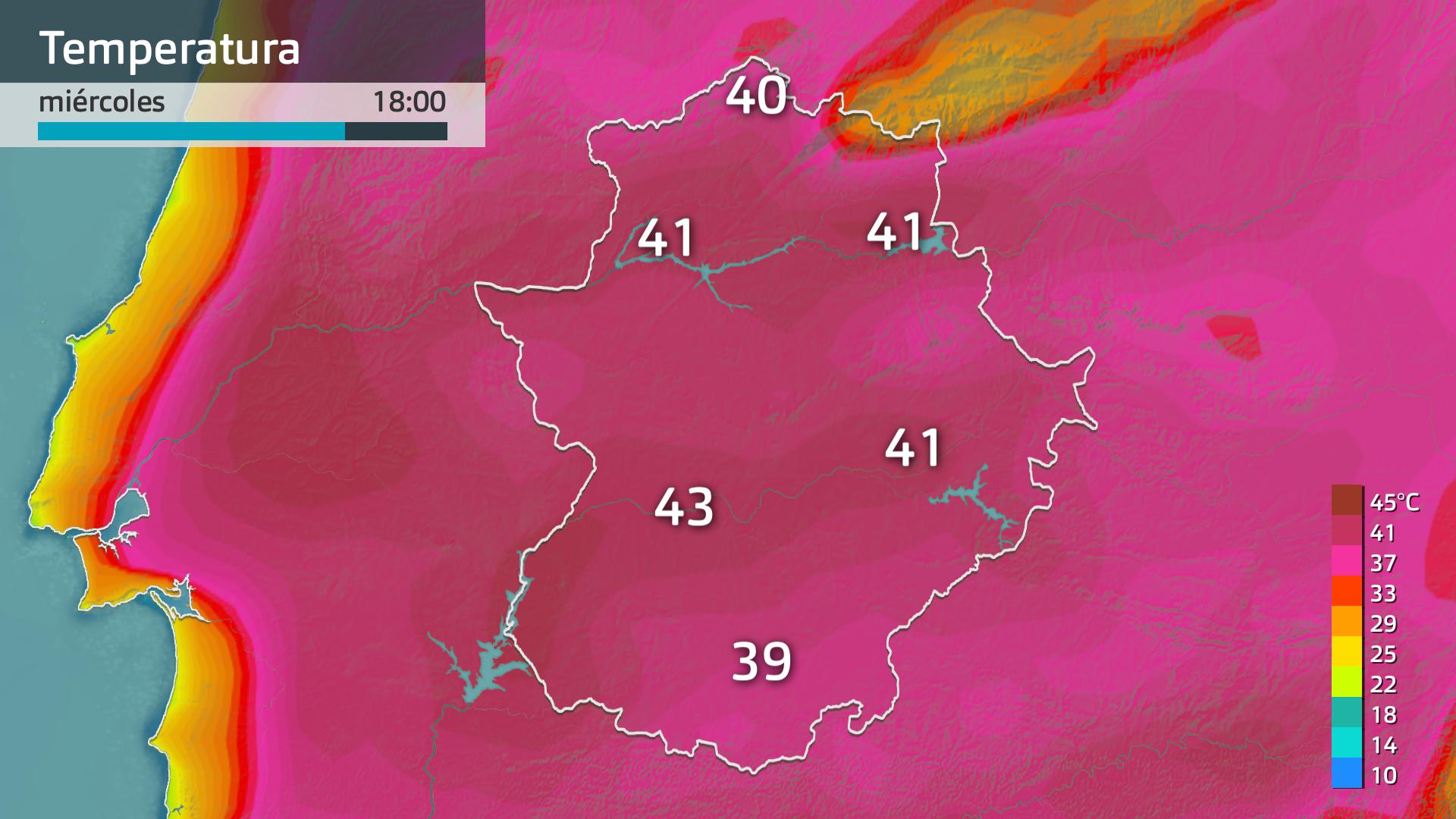 Las máximas, durante este miércoles, volverán a ser muy altas y superarán los 40 ºC en casi todas las poblaciones de la región. De nuevo, solamente se librarán las que están en zonas más altas. Y, de hecho, en el sur de Badajoz volverán a recuperarse, después del ligero descenso que han tenido este martes. En las Vegas Bajas del Guadiana podrán llegar, otra vez a los 43 ºC.