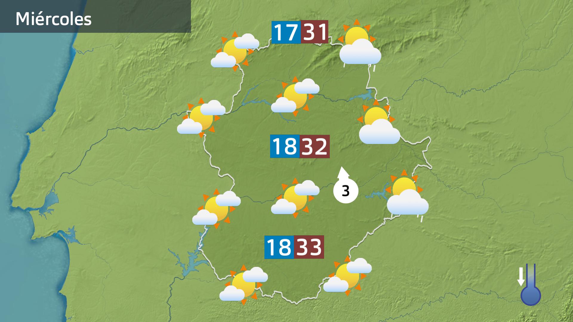 Las temperaturas más altas se quedarán entre los 33 y 34 grados. Será hacia el Campo Arañuelo y en comarcas del este de Badajoz. En el resto, por debajo. Las mínimas ya bajarán de los 20 grados y la madrugada no será tan cálida como la pasada.
