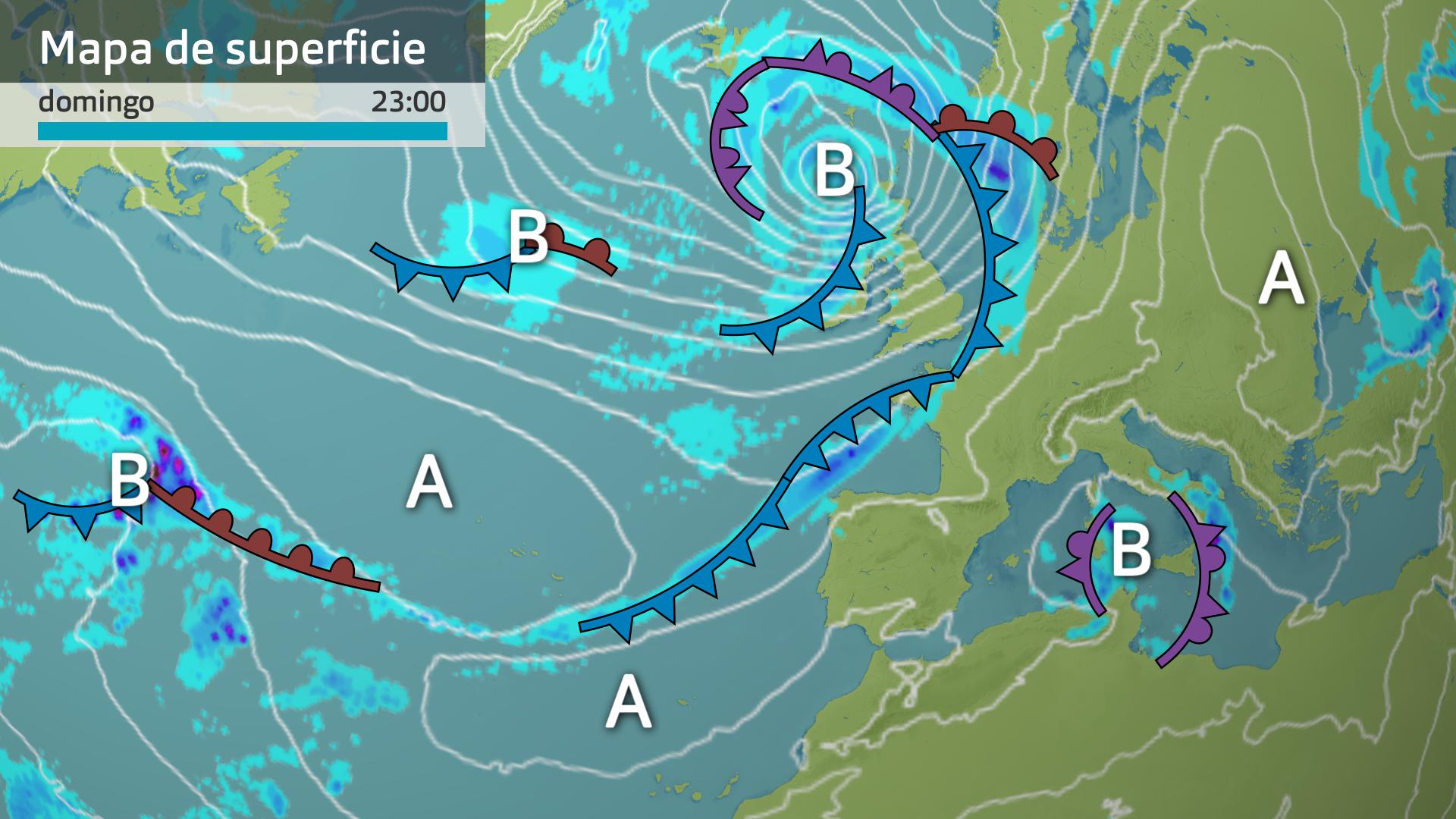 El mapa de superficie previsto para la noche del domingo nos muestra el dominio del anticiclón. Un centro de altas presiones que se extiende desde el Atlántico central hasta Europa del este, dominando el panorama meteorológico.