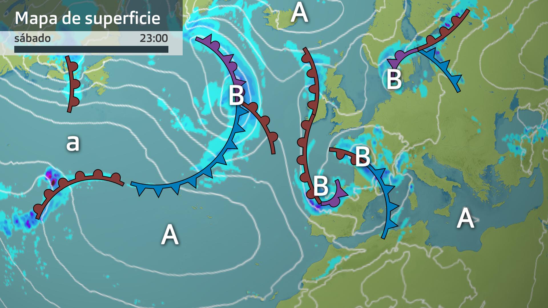 El mapa de superficie previsto para esta noche de sábado nos muestra un centro de bajas presiones en el noroeste peninsular. Asociado a él aparece un conjunto de sistemas. El de carácter cálido nos afectará mañana.