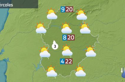 La posición de la borrasca favorecerá que las temperaturas sigan siendo relativamente suaves, a pesar de que este miércoles bajan las temperaturas entre 2 y 4 grados. Ya no llegaremos a más de 26 ºC como ha sucedido en la tarde de este martes. Las más altas rondarán los 22 ó 23 grados, que se darán en el suroeste. En el resto estaremos entre los 18 y 21 grados. Con mínimas sin muchas variaciones.
