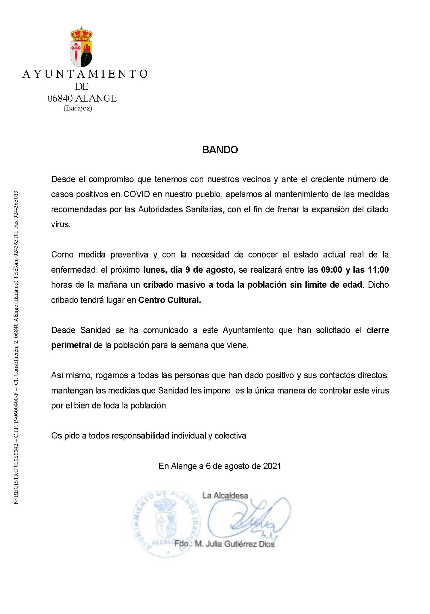 La Junta ha solicitado el cierre perimetral del municipio para la próxima semana. Lo ha anunciado el propio ayuntamiento de Alange a través de un bando.