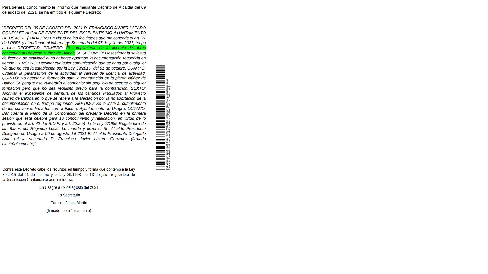 La defensa también denuncia que, en la actualidad, la planta opera de manera "alegal". Así lo refleja, asegura, un decreto de alcaldía de Usagre, firmado el pasado verano -concretamente el 9 de agosto de 2021- en el que aseguraba el consistorio que Iberdrola tenía que cesar su actividad porque no tenía licencia.