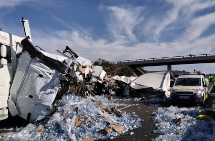 Uno de los camiones, que transportaba agua embotellada, colisionó con otro que cargaba cereal a granel y que, en el momento del impacto, estaba detenido por una avería.